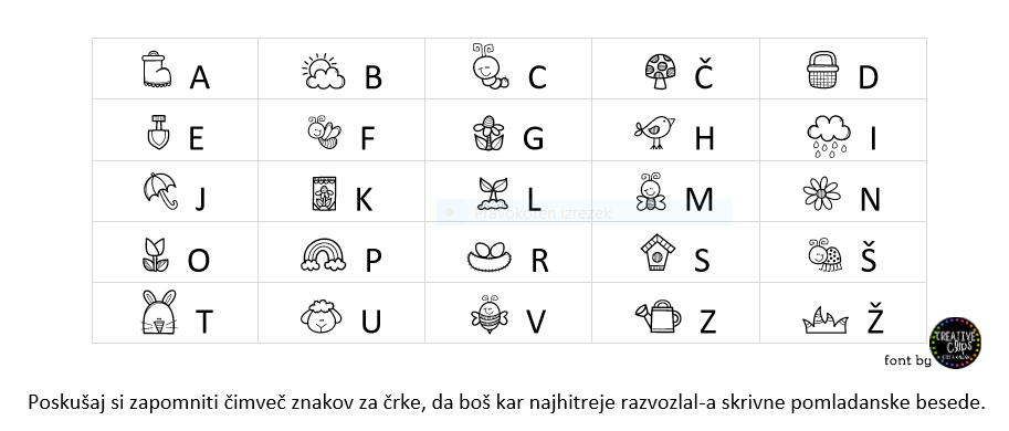 30. 3. 2020 Živjo. Upam, da si zdrava in da uspeš narediti vse za šolo. V kolikor me kaj potrebuješ, mi sporoči na mail ali me pokliči. Za danes sem ti pripravila nekaj vaj za vidno pomnjenje, koncentracijo in zaporedja. Najprej si dobro oglej spodnjo tabelo (okoli 2 minuti) in si poskušaj čim bolje zapomniti zanke za posamezno črko.